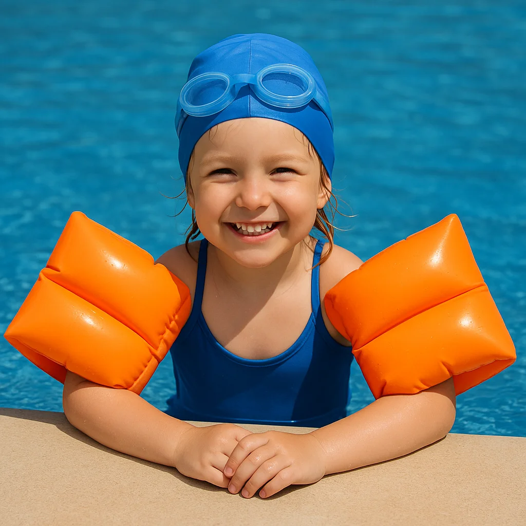 Imagem comemorativa de Dia das Crianças com crianças brincando ao redor de piscina iluminada, simbolizando segurança, alegria e tecnologia em projetos com iluminação LED subaquática da Cristal Led & Inox."
